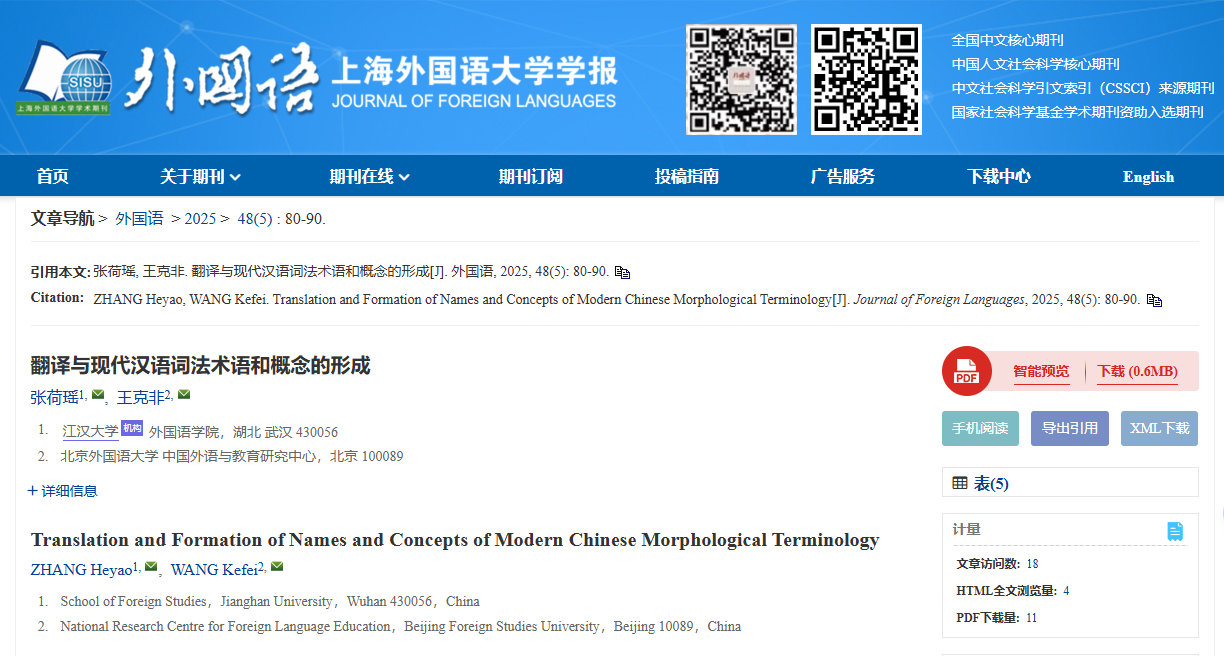 近日,我院英语系教师张荷瑶博士在外语类权威期刊《外国语》(CSSCI)发表题为“翻译与现代汉语词法术语和概念的形成”的学术论文。该论文为张荷瑶与北京外国语大学王克非教授合作成果,聚焦翻译在现代汉语词法术语和概念形成过程中的作用及带来的影响。
