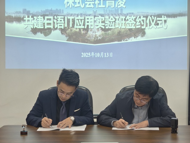 2025年10月13日上午,江汉大学外国语学院与株式会社青凌(以下简称“青凌公司”)合作共建的“日语+IT”实验班签约暨开班仪式隆重举行。在与会嘉宾的共同见证下,双方代表正式签署合作协议,并随即举行实验班开班仪式。仪式由2024级米雨馨同学主持。外国语学院党委书记张颖、副院长(主持行政工作)黄海泉、副院长杨惠芳、人工智能学院副院长李登实、青凌公司总经理张小光、技术总监黄欣、人力资源经理陈雁及实验班全体师生共同出席开班仪式,见证这一跨学科人才培养模式的重要里程碑。