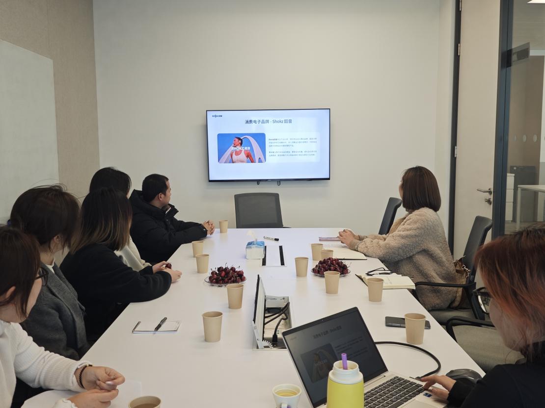 随后,双方移步会议室进行座谈交流。韶音科技国际业务部负责人赵经理对学院师生的到访表示热烈欢迎,系统介绍了公司从声学科技创新到全球品牌运营的发展路径,着重分享了在跨境电商领域的战略布局与业务实践,并结合公司国际业务发展的实际,阐述了对外语类人才在语言服务、跨文化沟通、市场拓展等方面的具体岗位需求与能力期待。